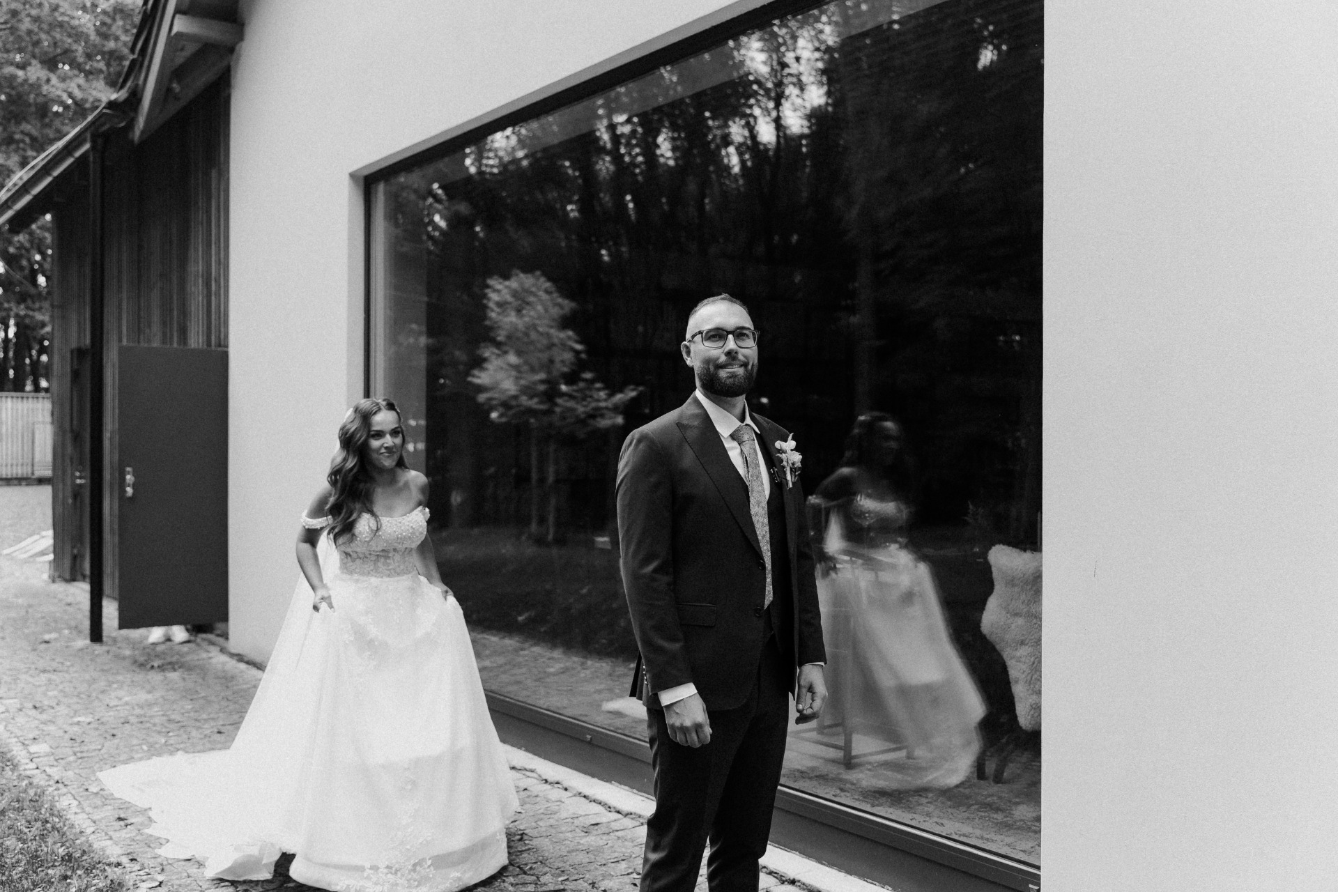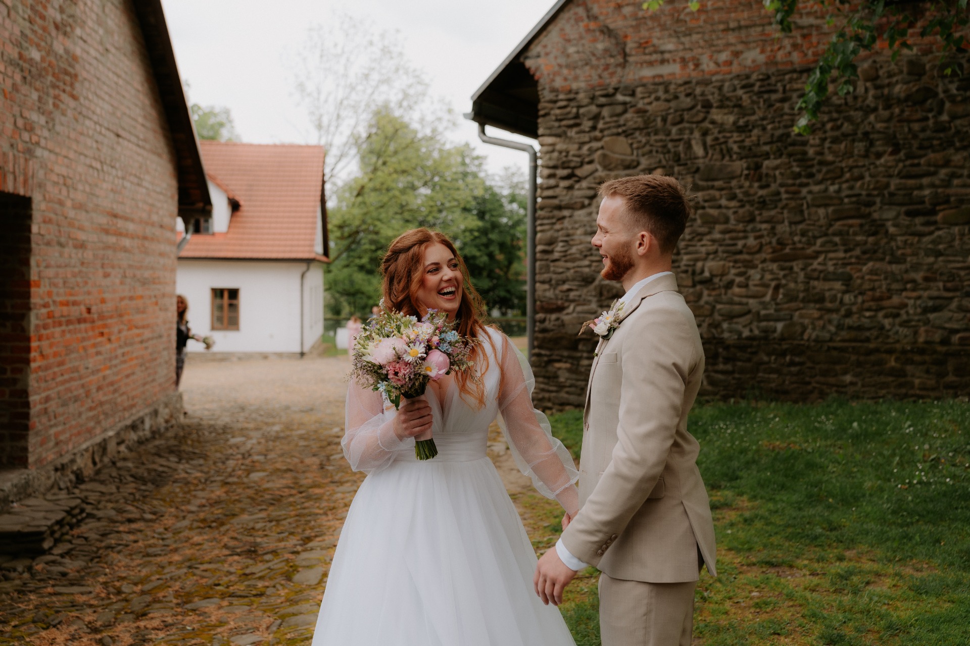 Soukromý moment, kdy se ženich a nevěsta poprvé vidí před obřadem. Tento okamžik může být emotivní a krásně zachycen na fotografiích.