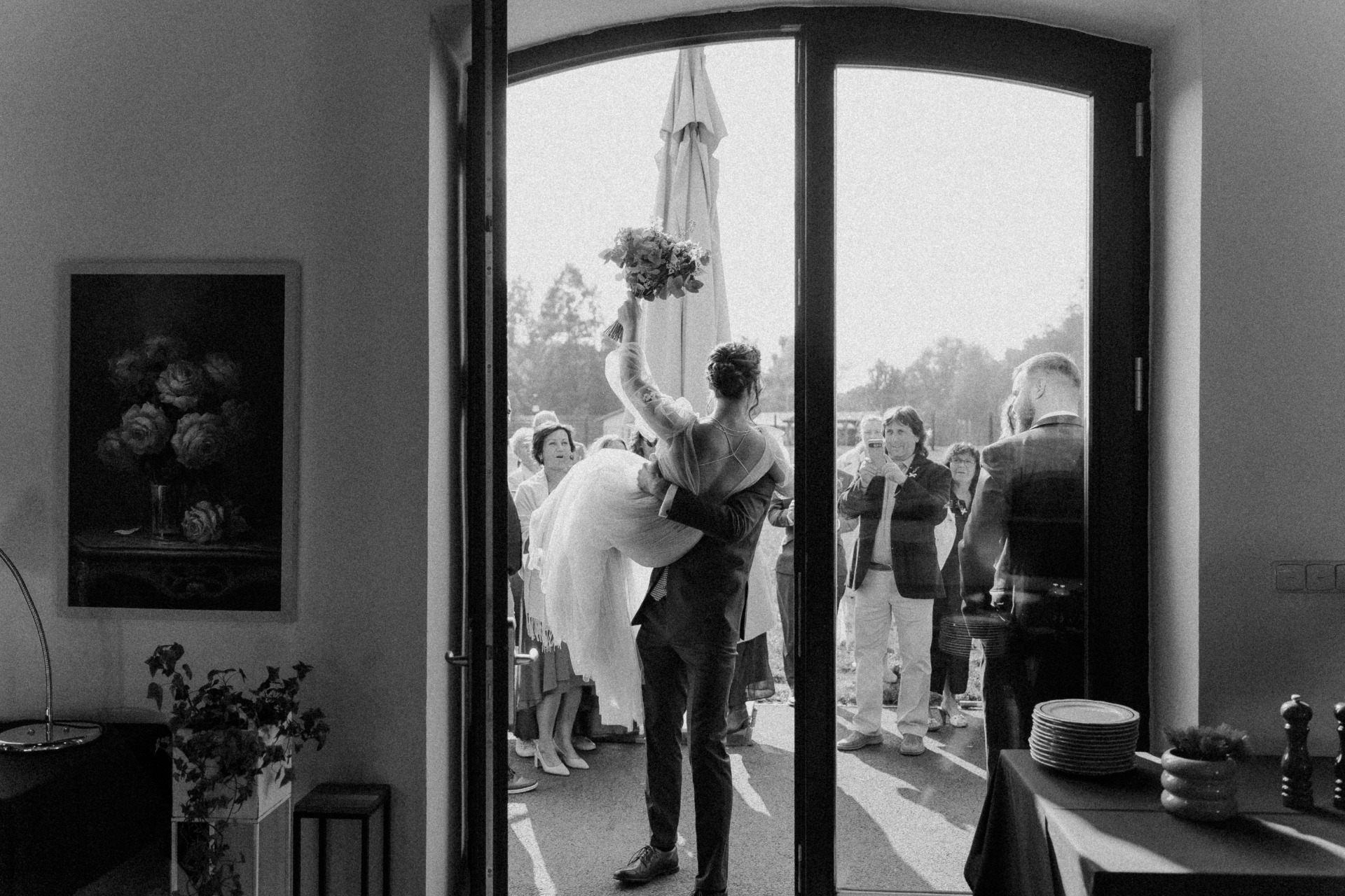 Přivítání, rozbíjení svatebního talíře, přenesení nevěsty přes práh